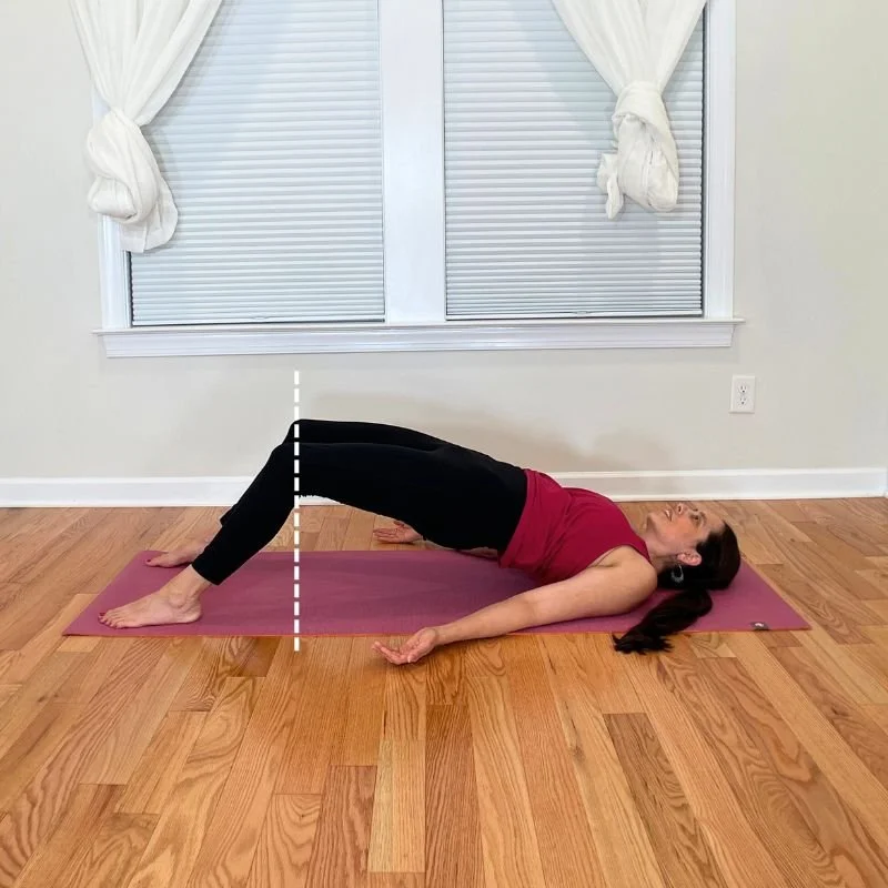 But here’s the catch: this effect is more relevant in the rehab-style bridge setup – where the feet are positioned slightly forward of the knees – than it is in the yoga-style bridge, where the heels are typically stacked directly under the knees.