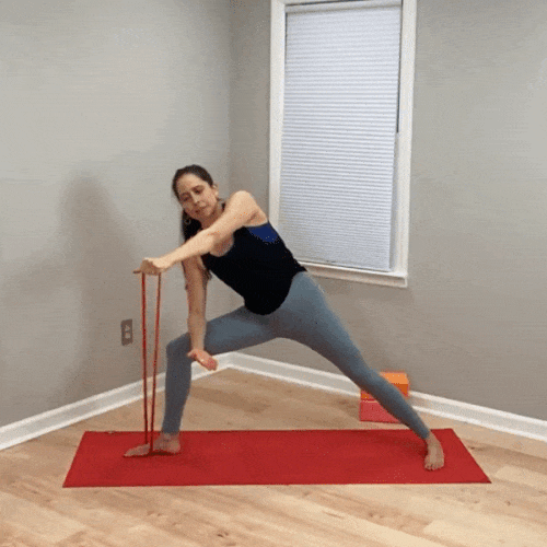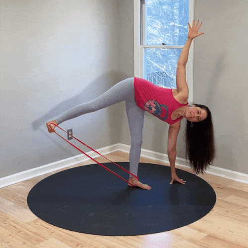 By using a resistance band in this way, we bring a novel element into this familiar pose.